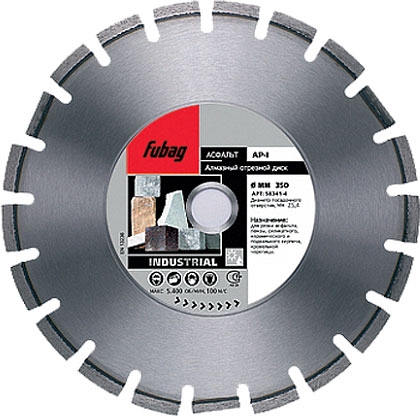 Алмазные диски по асфальту Fubag AP-I (Фубаг АП-И) предназначен для выполнения резов в асфальте и кирпиче при проведении дорожных работ с применением швонарезчиков, как с водяным охлаждением, так и без него.