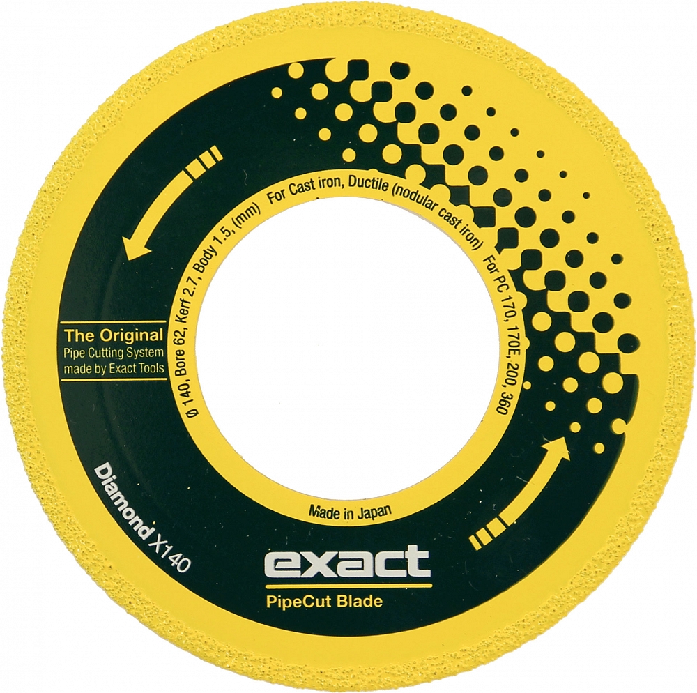 Алмазный круг Exact Diamond X140 (Экзакт Диамонд Икс140) – сверхмощный специальный алмазный диск только для резки труб из чугуна, ковкого чугуна (чугуна с шаровидным графитом), чугуна с бетонным слоем, стекловолокна. Подходит для электрических труборезов Exact PipeCut 170, 170E, 220E, 200, 360.