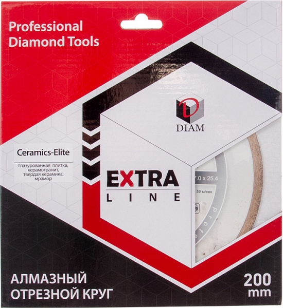 Алмазный отрезной круг Diam Extra Line 1A1R Корона Ceramics-Elite 200 мм (Диам Экстра Лайн 1А1Р Корона Керамикс-Элит 200 мм) – специальный алмазный круг со сплошной режущей кромкой для мокрой резки глазурованной плитки, твердой керамики, керамогранита, мрамора и аналогичных по своим характеристикам материалов на болгарках (ушм), штроборезах и плиткорезах электрических с подачей воды.