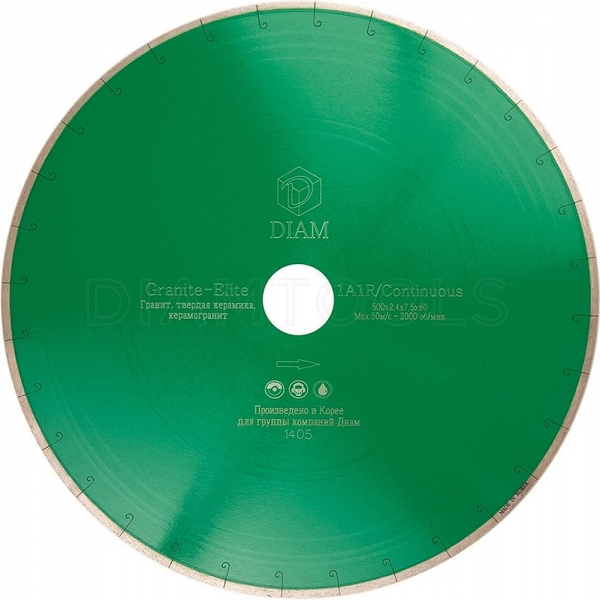 Алмазный отрезной круг Diam Extra Line 1A1R Корона Granite-Elite 500 мм (Диам Экстра Лайн 1А1Р Корона Гранит-Элит 500 мм) – премиальный алмазный диск для мокрой резки гранита, керамогранита, твердой керамики, кварцевого агломерата, оникса, мрамора, габбро, лабрадорита, базальта и других пород твердого натурального камня на камнерезных станках, стенорезных машинах, швонарезчиках с подачей воды. За долгое время зарекомендовал себя с отличной стороны у многих мастеров, как инструмент, обеспечивающий очень качественное выполнение задач практически по всем твердым материалам, при этом имеет очень большой ресурс и скорость работы.