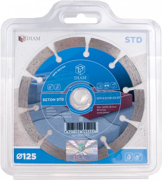 Алмазный отрезной круг Diam STD 1A1RSS Бетон 125 мм (Диам СТД 1А1РСС Бетон 125 мм) – сегментный алмазный диск для сухой резки бетона, кирпича, тротуарной плитки, природного камня, без водяного охлаждения.