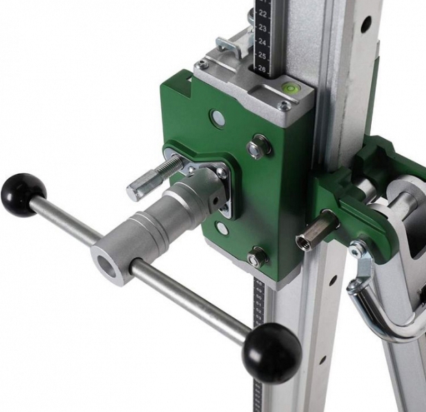 - Возможность сверления как со станины, так и "с рук": наличие кольца 60 мм для крепления на станину и пистолетной рукоятки с дополнительной регулируемой передней ручкой для сверления без штатива