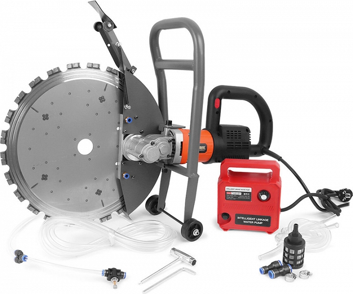 - В комплекте идет все необходимое, чтобы сразу начать работу: режущее алмазное кольцо, помпа для подачи воды, шланги