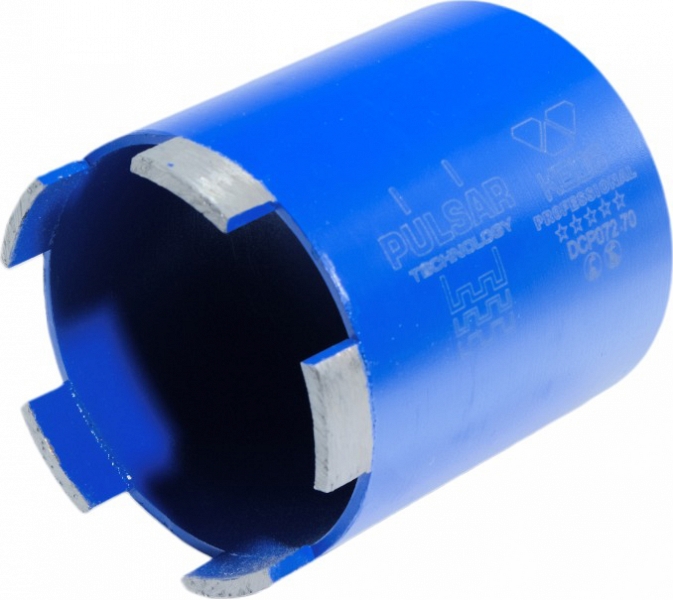 - Алмазные сегменты, приваренные к корпусу лазером, позволяют осуществлять бурение без подачи воды
