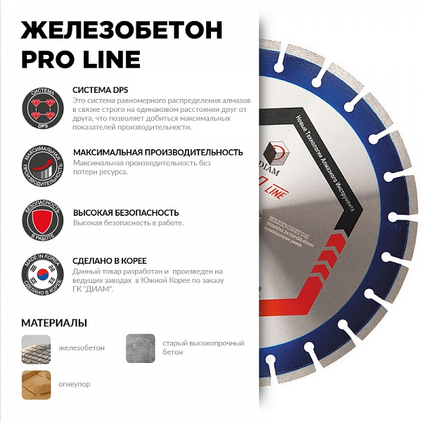 Сегментный алмазный круг Diam Pro Line 1A1RSS Железобетон 450 мм (Диам Про Лайн 1А1РСС Железобетон 450 мм) – профессиональный алмазный отрезной диск с лазерной сваркой сегментов, произведенный по технологии DPS – позиционирования алмазов в режущем слое, для сухой и мокрой резки железобетона, старого высокопрочного бетона, огнеупоров на камнерезных станках, стенорезных машинах, швонарезчиках, как с охлаждением, так и без.