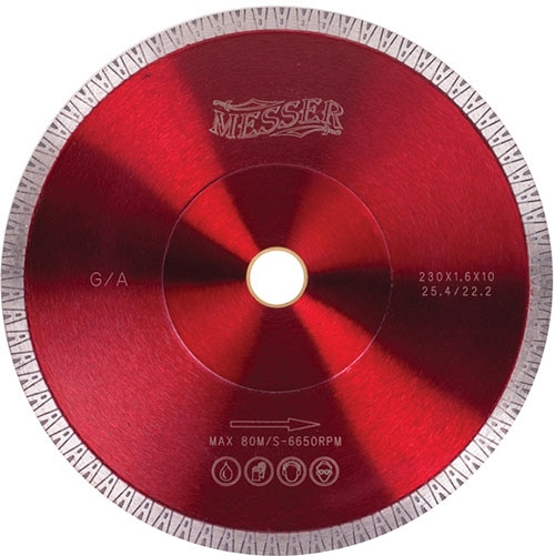 Ультратонкие алмазные диски по граниту Messer G/A (Мессер Г/А) предназначены для резки твердых классов гранита, габбро, базальта, кварцита, клинкера, бакора и другого твердого камня с обязательной подачей воды.